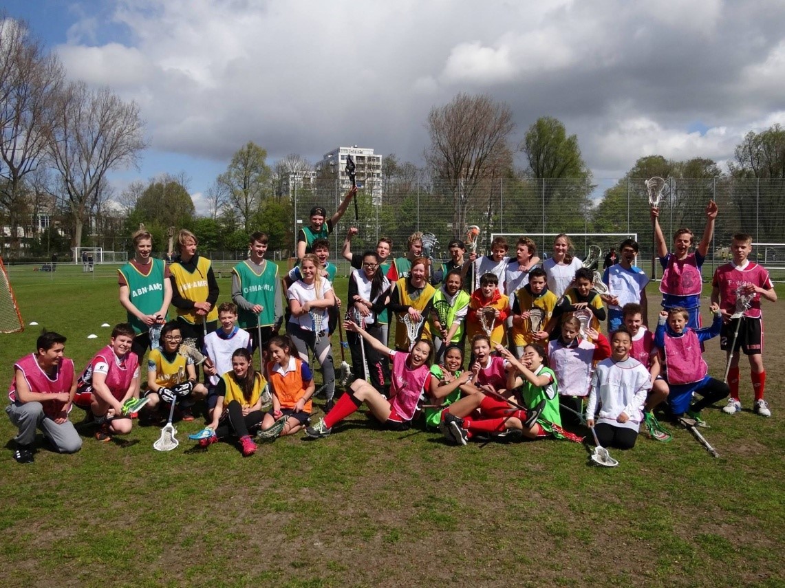 We are the youth team of Amsterdam Lacrosse. Lacrosse is a fast, tactical team sport, played with a stick which has a net at the end. The aim is to shoot the ball into the opponent’s goal. It sounds difficult, but you’ll get the hang of it very soon!
